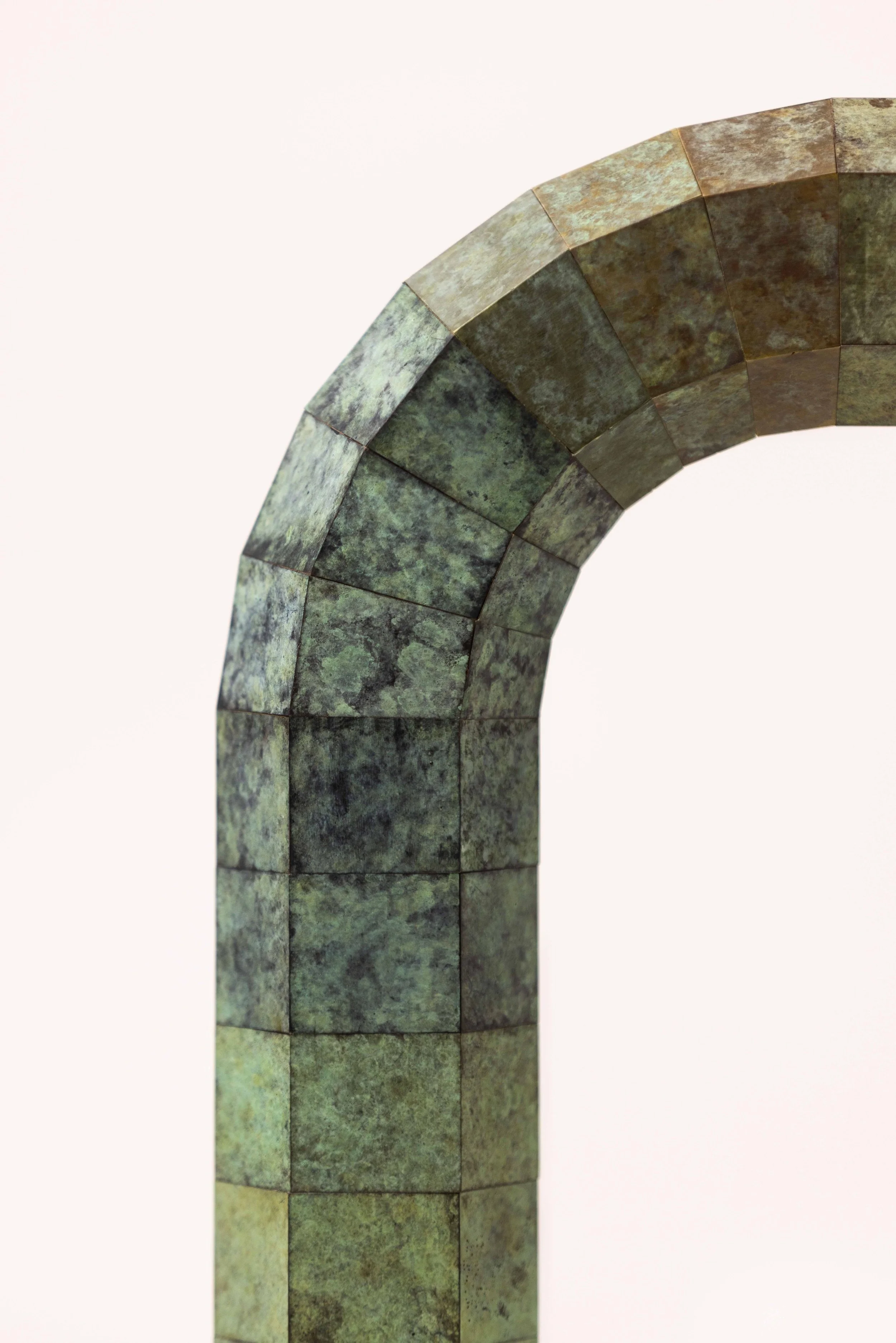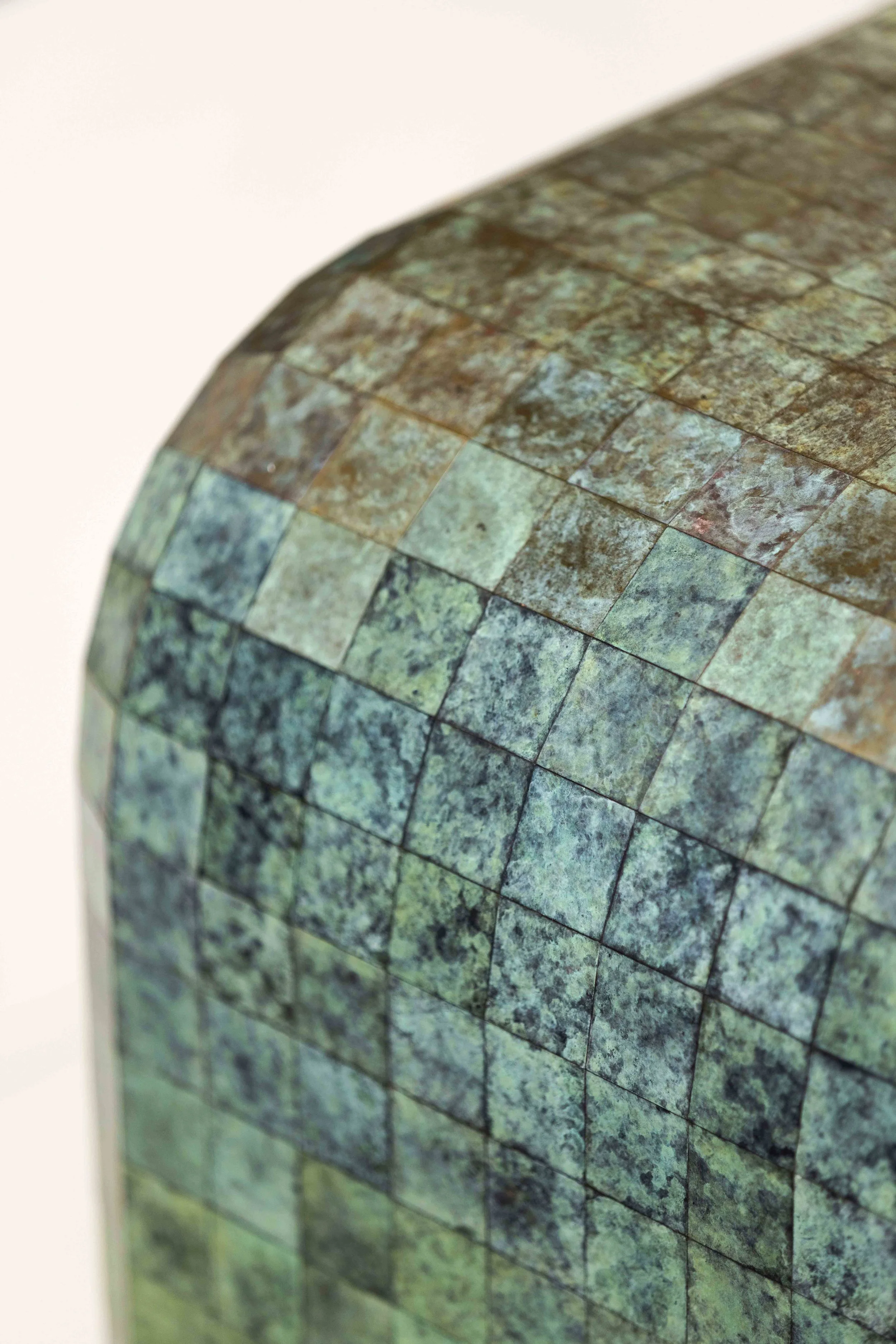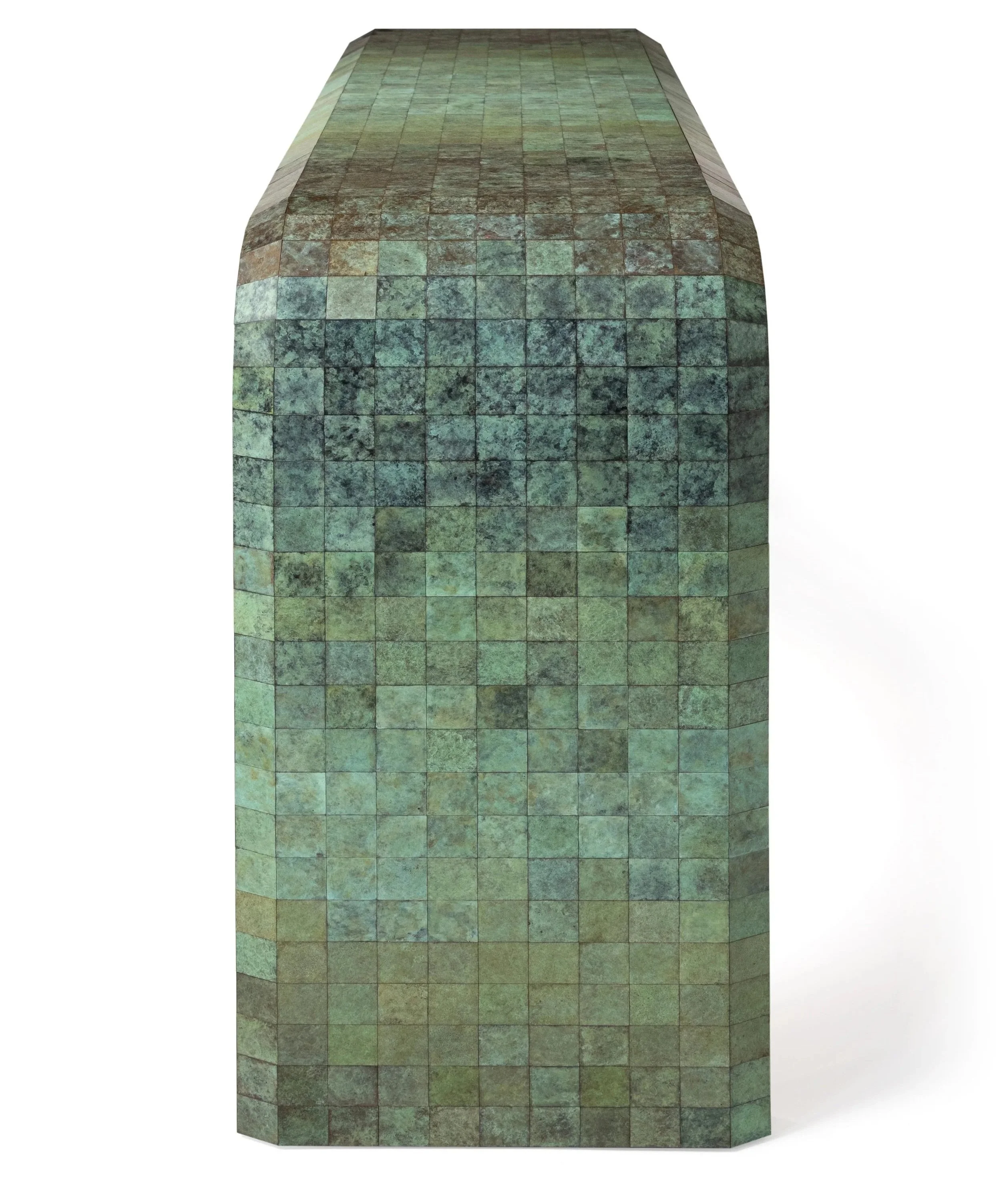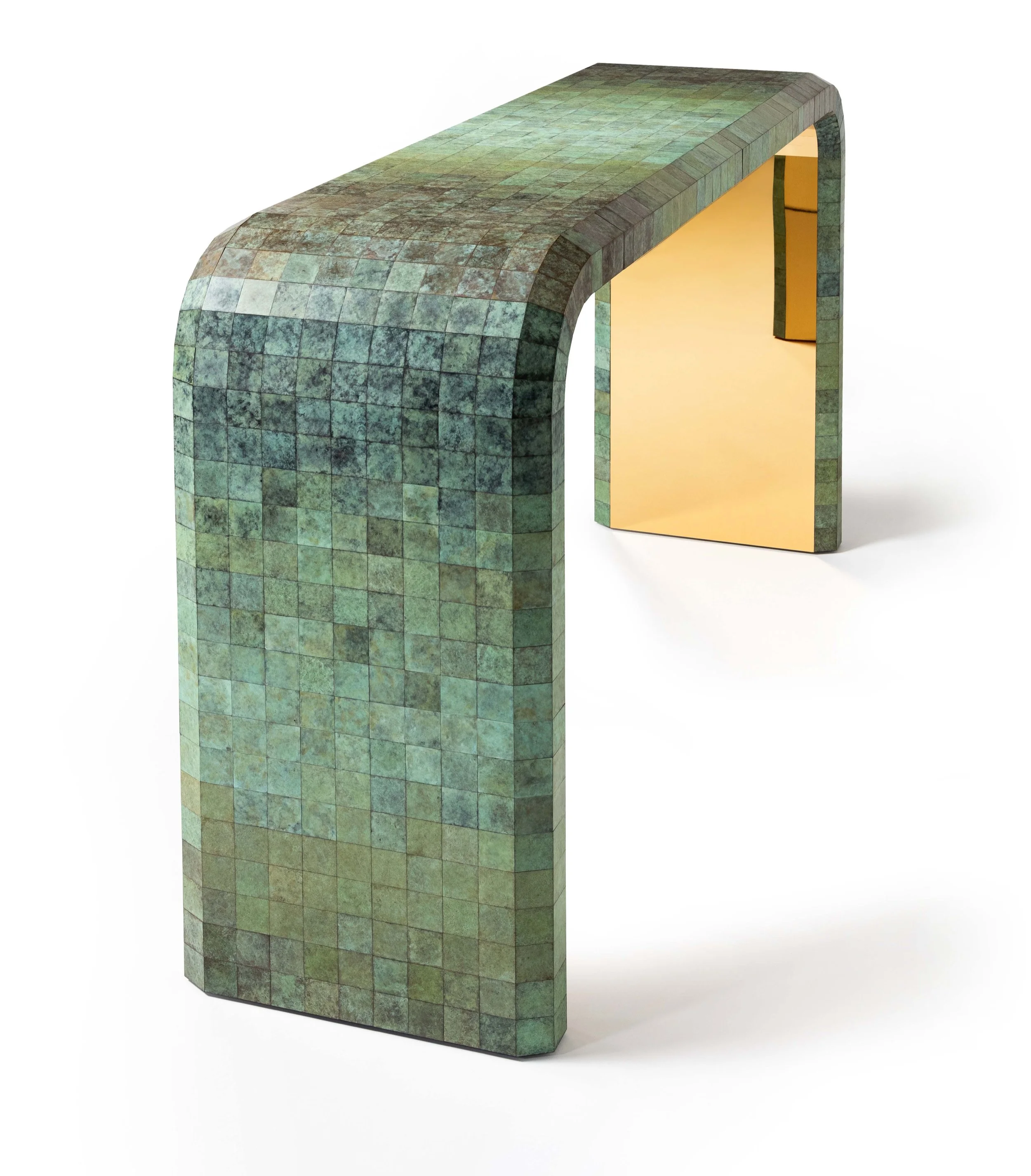 The Quilt Console Table is inspired by the ancient tradition of quilting. Comprised of over 1,200 individually patinated brass panels, it translates the stitching together of small fabric pieces, into a sculptural work of metal. Each panel is assembled by hand, forming an elegant surface of incremental tonal change that when viewed as a whole, creates a shifting spectrum of colour throughout the work. The internal faces of mirror-polished brass, catch and reflect light to intensify the table’s sculptural presence. The precise geometry and organic patina merge craft and design, making each table unique while celebrating the beauty of repetition and detail.